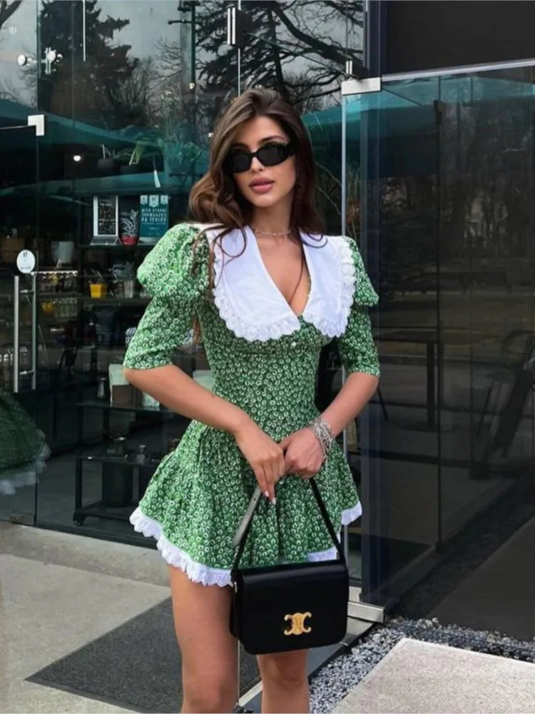 Floral Dress with Doll Neck and Short Sleeves